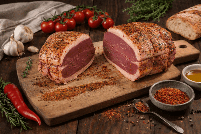 Nouveau : Le rôti est composé de deux magrets ficelés et assaisonnés avec le piment d’Espelette, l’ail et des herbes de Provence pour un goût plus doux et unique.