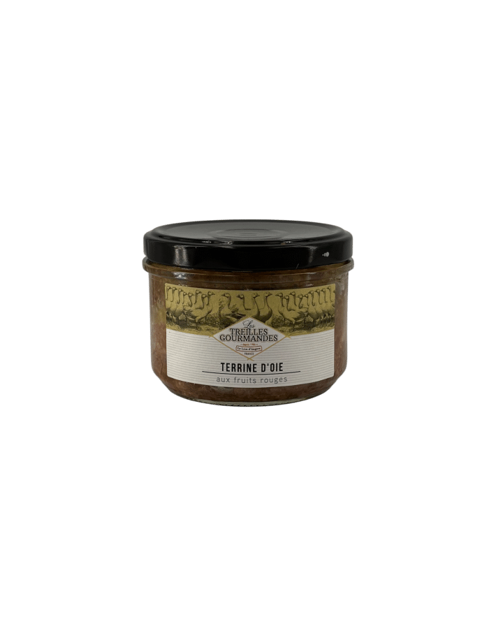 Gorge de porc 43% (origine France), viande d’oie 34% (origine UE), foie de volaille, mélange fruits rouges 3% (cassis, groseilles rouges, griottes, framboises, mûres, myrtilles), OEUFS, vin rouge, crème de cassis, amidon de maïs, sel, poivre, échalotes, ail, thym.